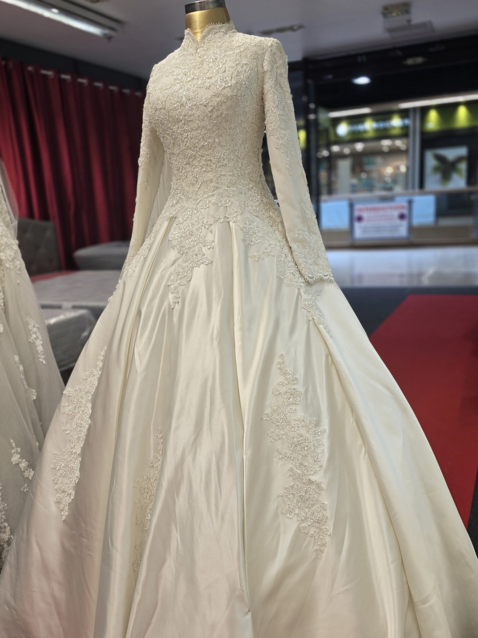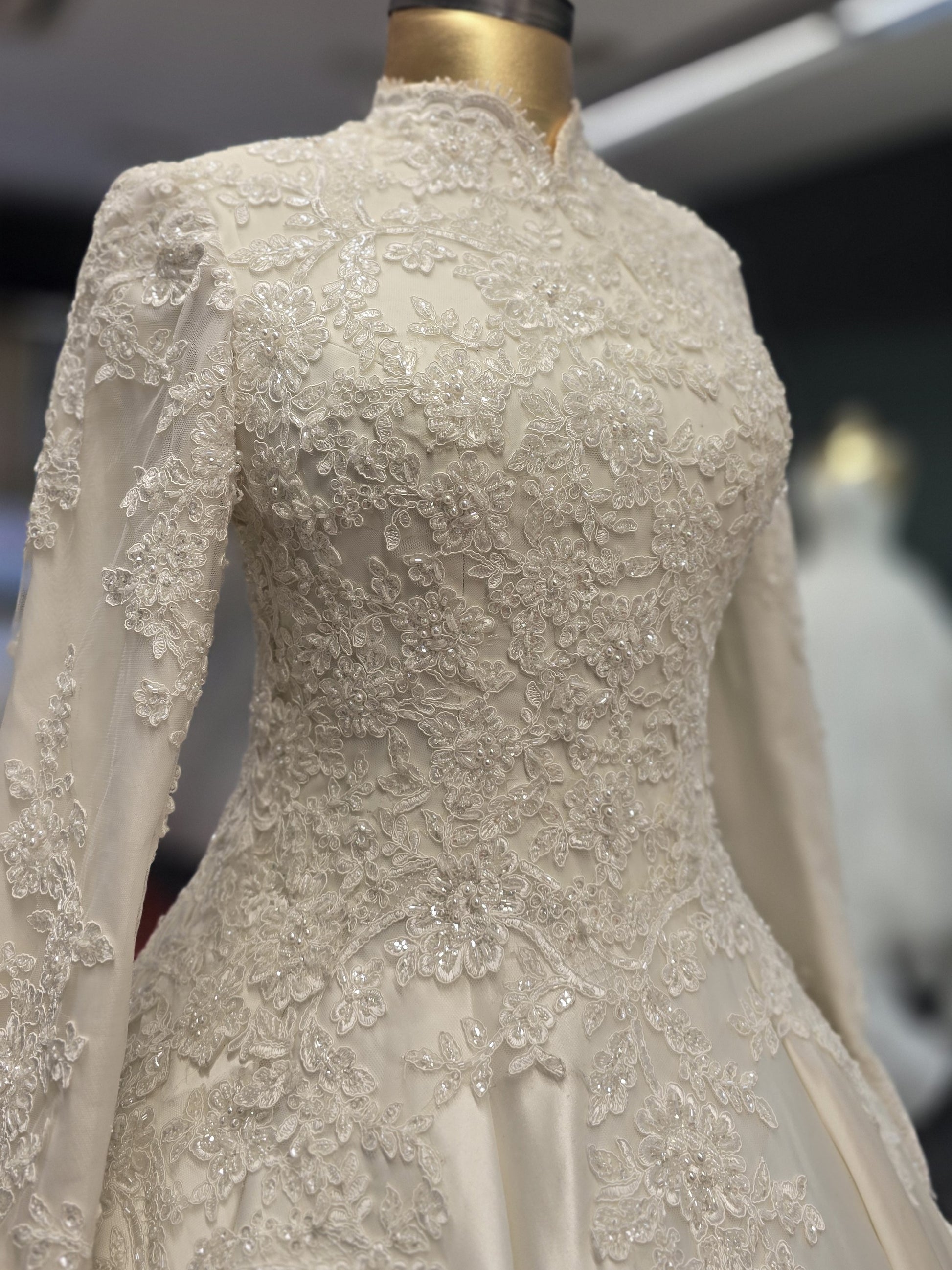 Magnifique robe de mariée style princesse avec manches longues, col montant et broderies perlées faites main.