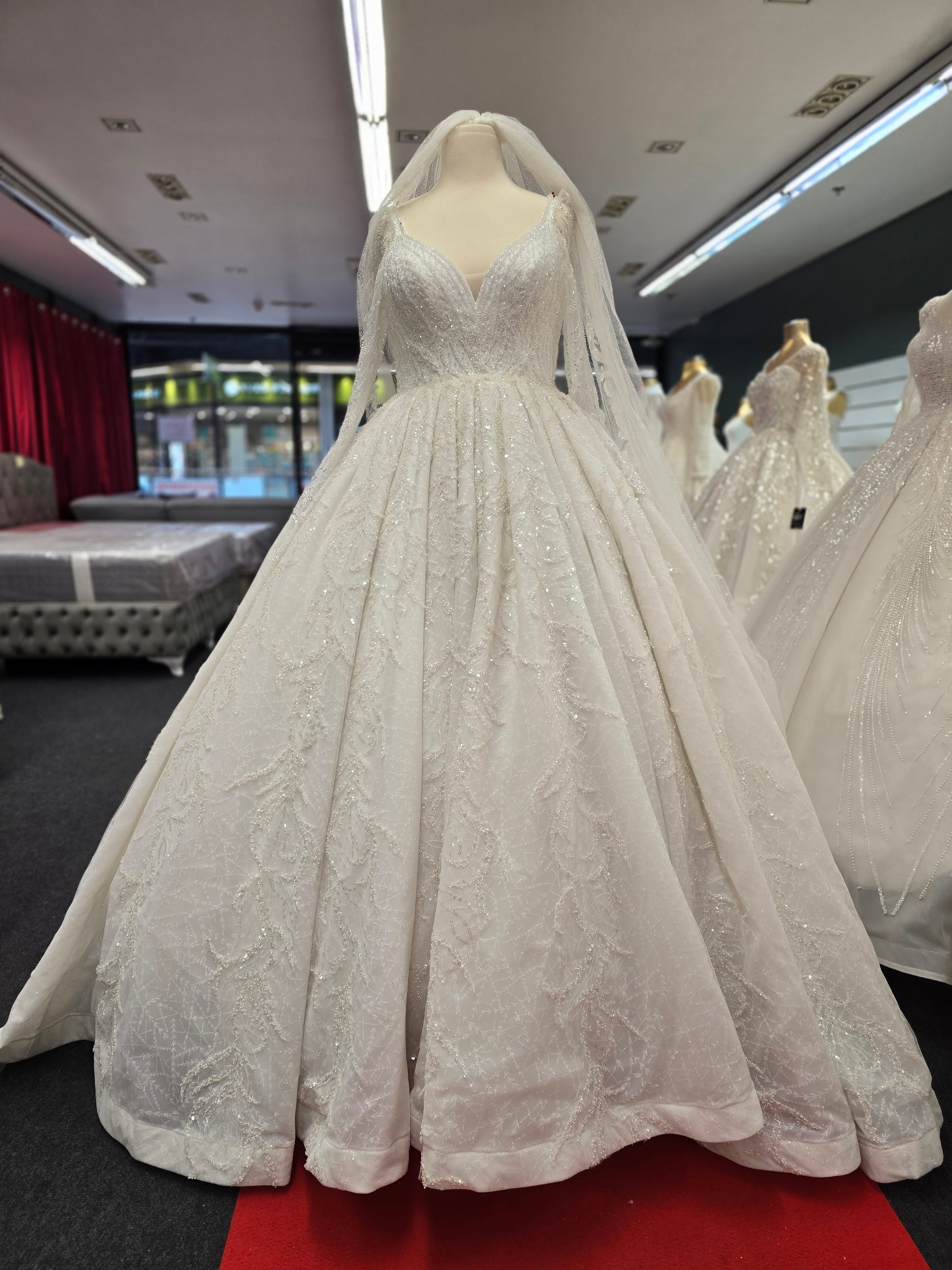 Magnifique robe de mariée style princesse sans manches, broderies perlées faites main.