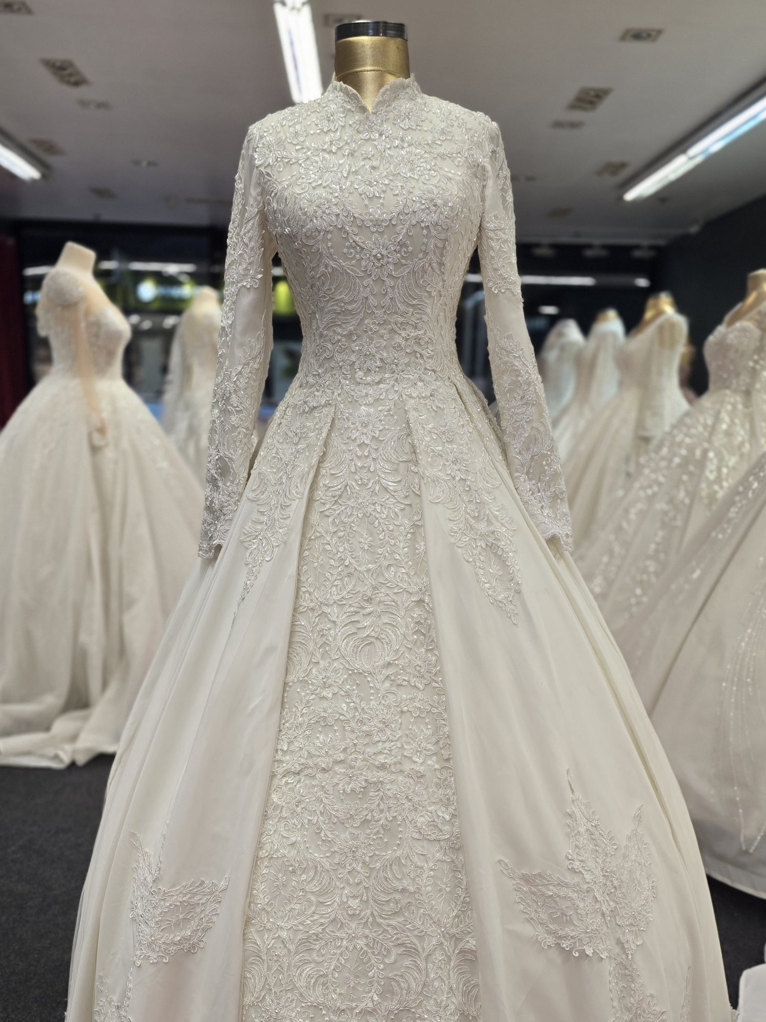 Magnifique robe de mariée style princesse avec manches, broderies perlées faites main.