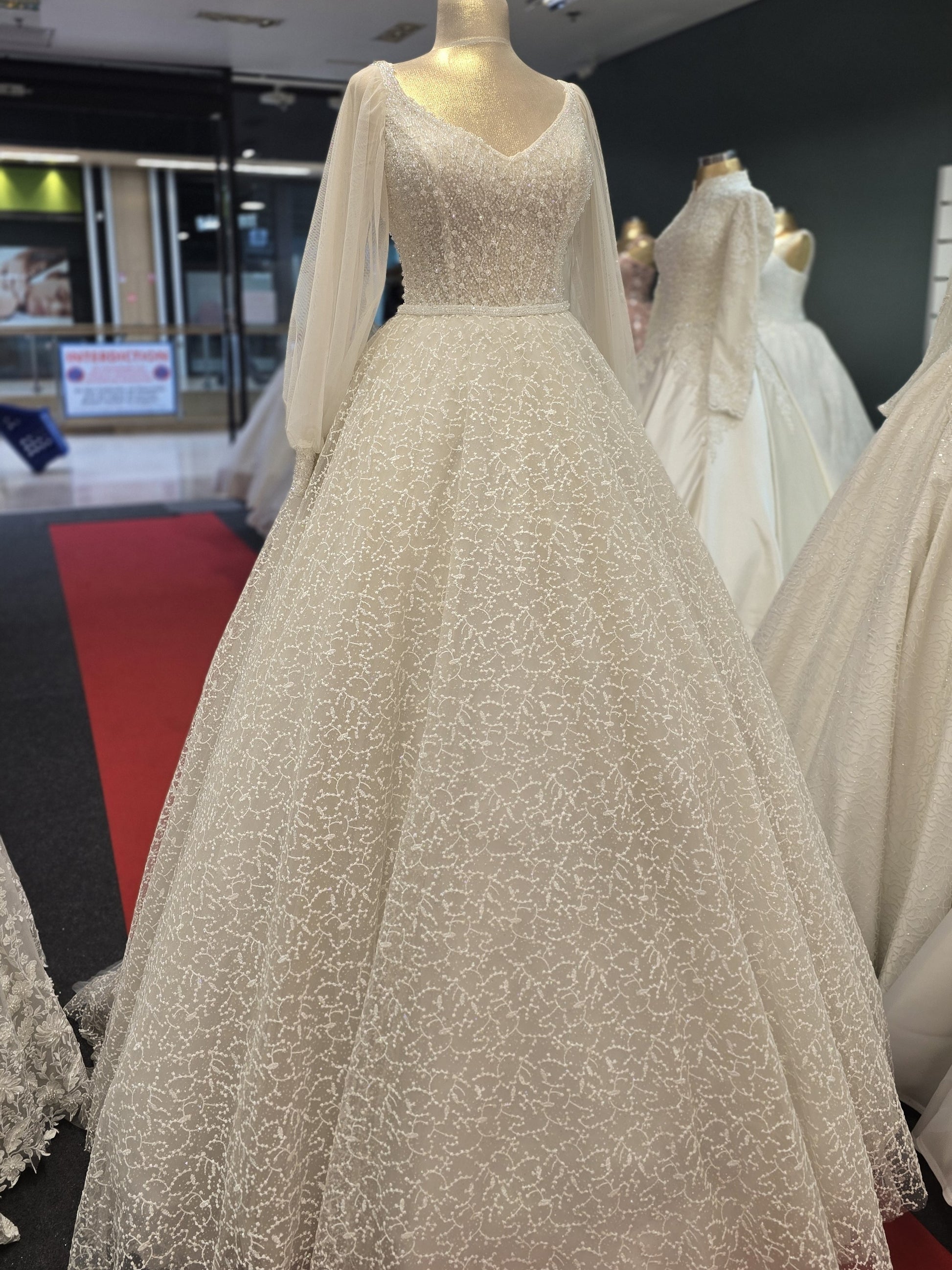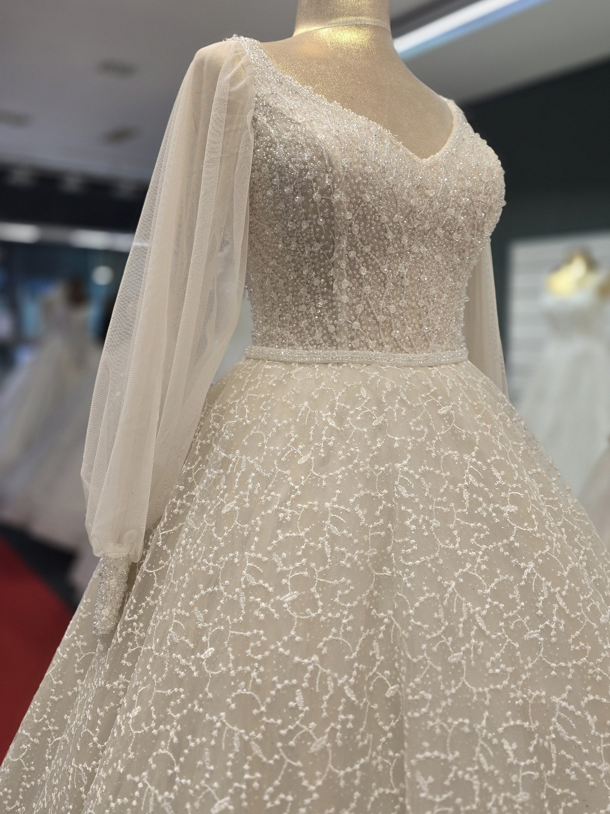 Magnifique robe de mariée style princesse avec manches, decoltee en cœur et broderies perlées faites main.